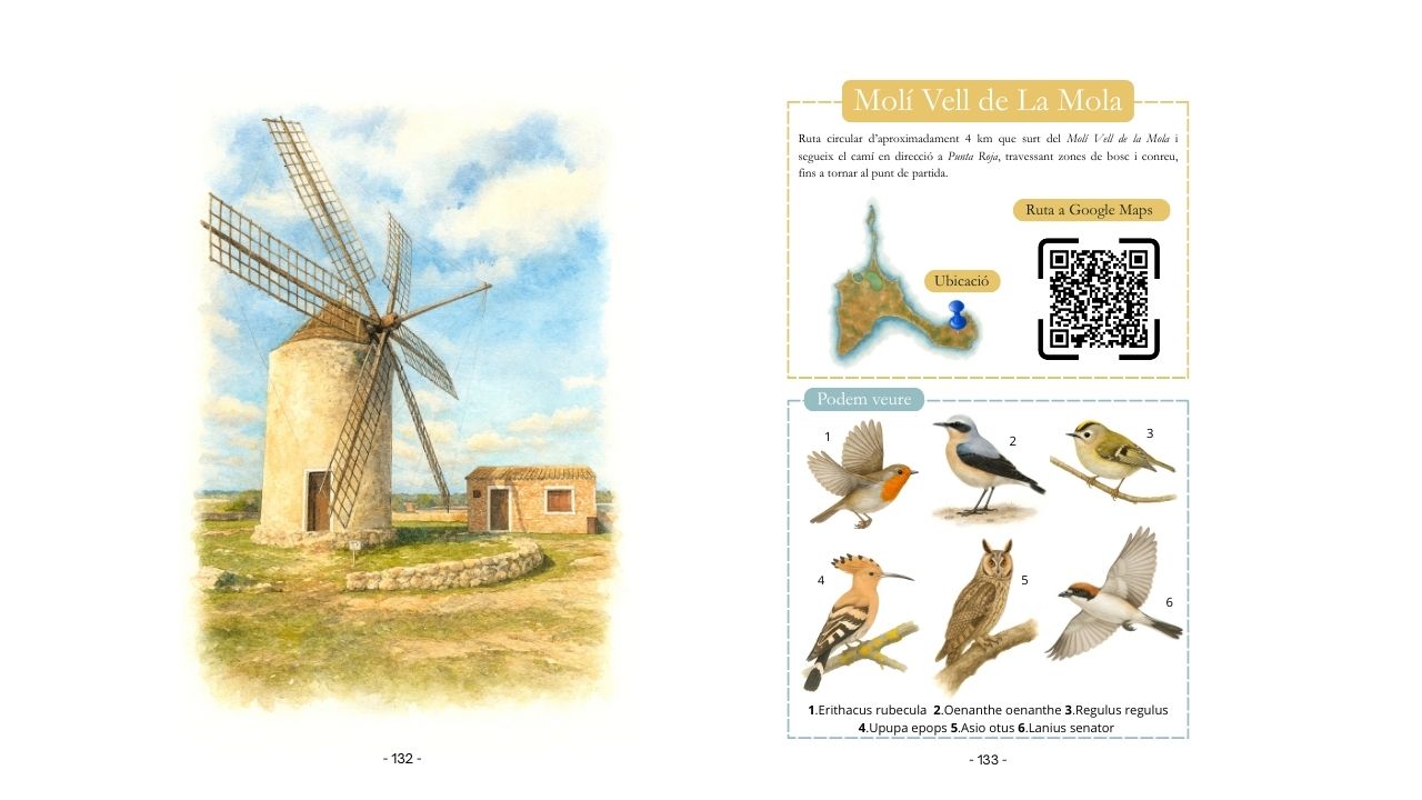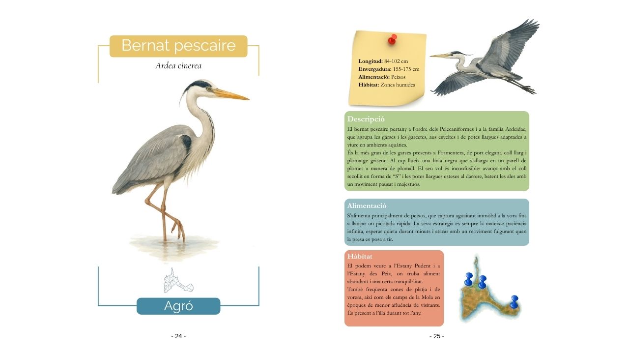 De cada espècie hi trobaràs el seu nom comú, el seu nom científic i també el nom amb què es coneix a Formentera, una cosa que em semblava important per connectar el contingut amb la manera com tradicionalment s’ha parlat d’aquestes aus a l’illa. Acompanyant les il·lustracions, incloc informació clara i accessible sobre la descripció de l’au, la seva alimentació i l’hàbitat que ocupa a Formentera.
